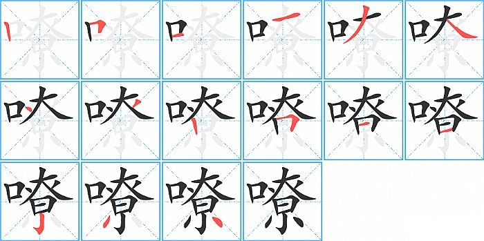 嘹是左右结构,嘹的部首是“口”,部外笔画12画,总笔画15画,嘹的笔画顺序是“竖、横折、横、横、撇、捺、点、撇、竖、横折、横、横、竖钩、撇、点”。看看“嘹”字什么意思 >>