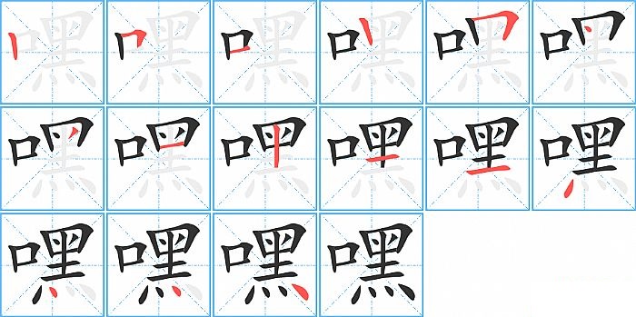 嘿是左右结构,嘿的部首是“口”,部外笔画12画,总笔画15画,嘿的笔画顺序是“竖、横折、横、竖、横折、点、撇、横、竖、横、横、点、点、点、点”。看看“嘿”字什么意思 >>