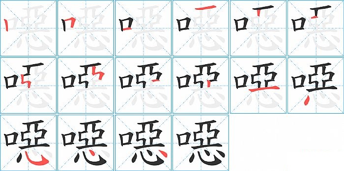 噁是左右结构,噁的部首是“口”,部外笔画12画,总笔画15画,噁的笔画顺序是“竖、横折、横、横、竖、横、竖折撇/竖折折、竖折撇/竖折折、横、竖、横、点、斜钩、点、点”。看看“噁”字什么意思 >>