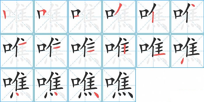 噍是左右结构,噍的部首是“口”,部外笔画12画,总笔画15画,噍的笔画顺序是“竖、横折、横、撇、竖、点、横、横、横、竖、横、点、点、点、点”。看看“噍”字什么意思 >>