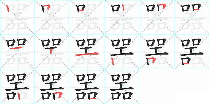 噐是上中下结构,噐的部首是“口”,部外笔画12画,总笔画15画,噐的笔画顺序是“竖、横折、横、竖、横折、横、横、竖、横、竖、横折、横、竖、横折、横”。看看“噐”字什么意思 >>