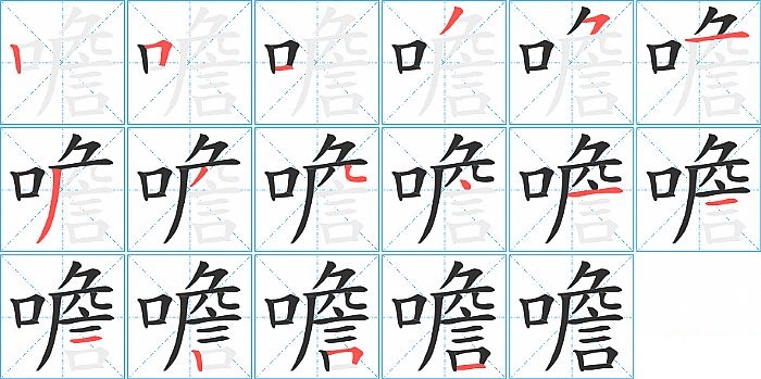 噡是左右结构,噡的部首是“口”,部外笔画13画,总笔画16画,噡的笔画顺序是“竖、横折、横、撇、横撇/横钩、横、撇、撇、点、点、横、横、横、竖、横折、横”。看看“噡”字什么意思 >>