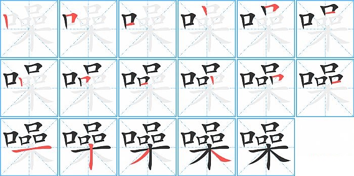 噪是左右结构,噪的部首是“口”,部外笔画13画,总笔画16画,噪的笔画顺序是“竖、横折、横、竖、横折、横、竖、横折、横、竖、横折、横、横、竖、撇、捺”。看看“噪”字什么意思 >>