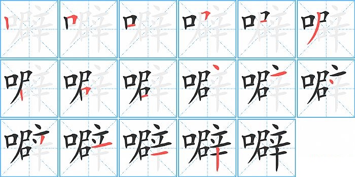 噼是左右结构,噼的部首是“口”,部外笔画13画,总笔画16画,噼的笔画顺序是“竖、横折、横、横折、横、撇、竖、横折、横、点、横、点、撇、横、横、竖”。看看“噼”字什么意思 >>