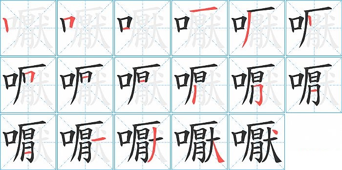 嚈是左右结构,嚈的部首是“口”,部外笔画14画,总笔画17画,嚈的笔画顺序是“竖、横折、横、横、撇、竖、横折、横、横、竖、横折钩、横、横、横、撇、捺、点”。看看“嚈”字什么意思 >>