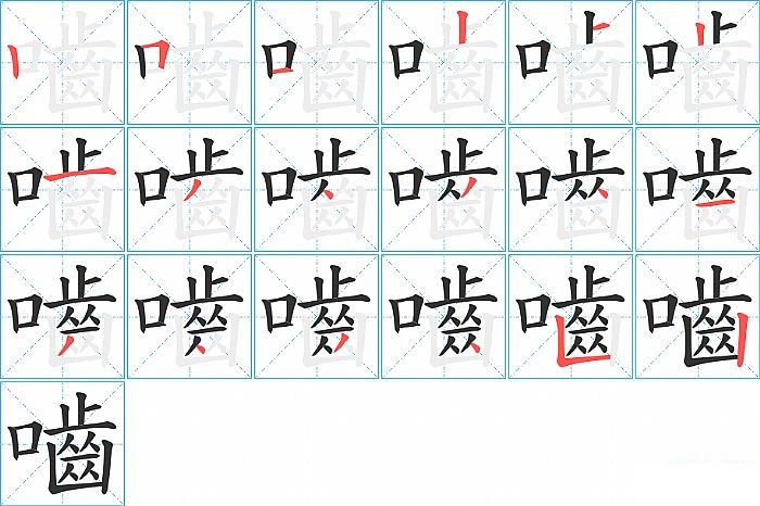 嚙是左右结构,嚙的部首是“口”,部外笔画15画,总笔画18画,嚙的笔画顺序是“竖、横折、横、竖、横、竖、横、撇、点、撇、点、横、撇、点、撇、点、竖折/竖弯、竖”。看看“嚙”字什么意思 >>