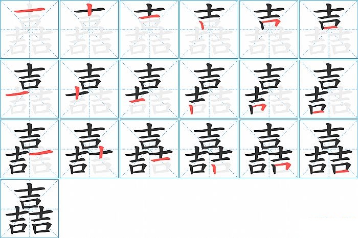 嚞是上下结构,嚞的部首是“口”,部外笔画15画,总笔画18画,嚞的笔画顺序是“横、竖、横、竖、横折、横、横、竖、横、竖、横折、横、横、竖、横、竖、横折、横”。看看“嚞”字什么意思 >>