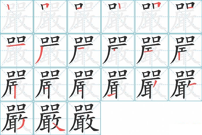 嚴是上下结构,嚴的部首是“口”,部外笔画16画,总笔画19画,嚴的笔画顺序是“竖、横折、横、竖、横折、横、横、撇、横撇/横钩、横、竖、竖、横、横、提、撇、横、撇、捺”。看看“嚴”字什么意思 >>