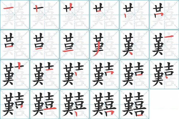 囏是左右结构,囏的部首是“口”,部外笔画20画,总笔画23画,囏的笔画顺序是“横、竖、竖、横、竖、横折、横、横、横、撇、点、横、竖、横、竖、横折、横、点、撇、横、竖、横折、横”。看看“囏”字什么意思 >>