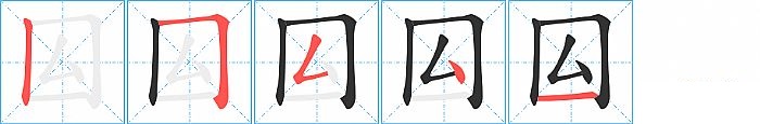 囜是全包围结构,囜的部首是“囗”,部外笔画2画,总笔画5画,囜的笔画顺序是“竖、横折、撇折、点、横”。
