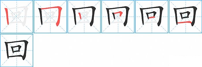 回是全包围结构,回的部首是“囗”,部外笔画3画,总笔画6画,回的笔画顺序是“竖、横折、竖、横折、横、横”。