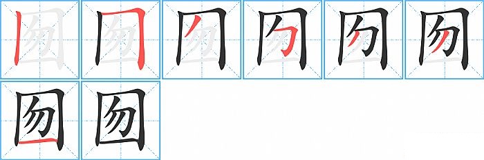 囫是全包围结构,囫的部首是“囗”,部外笔画4画,总笔画7画,囫的笔画顺序是“竖、横折、撇、横折钩、撇、撇、横”。