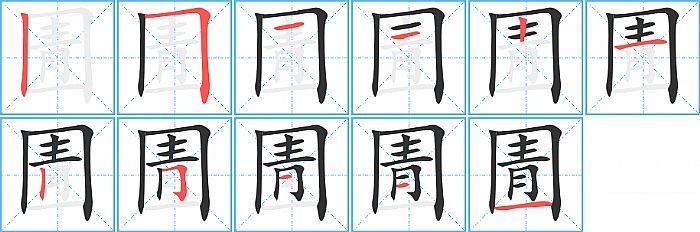 圊是全包围结构,圊的部首是“囗”,部外笔画8画,总笔画11画,圊的笔画顺序是“竖、横折、横、横、竖、横、竖、横折钩、横、横、横”。看看“圊”字什么意思 >>