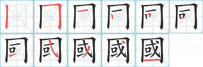 國是全包围结构,國的部首是“囗”,部外笔画8画,总笔画11画,國的笔画顺序是“竖、横折、横、竖、横折、横、提、斜钩、撇、点、横”。看看“國”字什么意思 >>