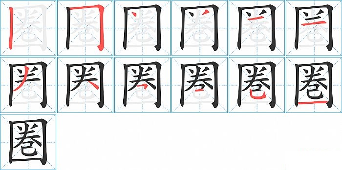 圏是全包围结构,圏的部首是“囗”,部外笔画9画,总笔画12画,圏的笔画顺序是“竖、横折、点、撇、横、横、撇、捺、横折、横、竖弯钩、横”。看看“圏”字什么意思 >>