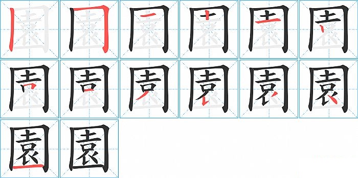 園是全包围结构,園的部首是“囗”,部外笔画10画,总笔画13画,園的笔画顺序是“竖、横折、横、竖、横、竖、横折、横、撇、竖、撇、点、横”。看看“園”字什么意思 >>