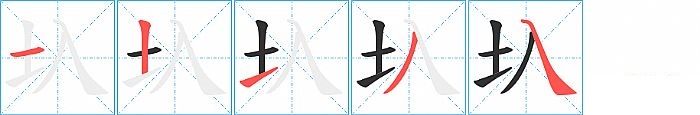 圦是左右结构,圦的部首是“土”,部外笔画2画,总笔画5画,圦的笔画顺序是“横、竖、提、撇、捺”。