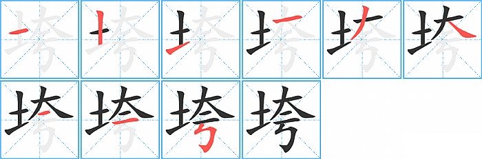 垮是左右结构,垮的部首是“土”,部外笔画6画,总笔画9画,垮的笔画顺序是“横、竖、提、横、撇、捺、横、横、竖折折钩”。