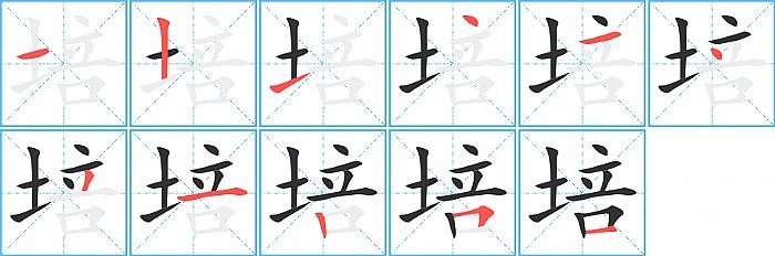 培是左右结构,培的部首是“土”,部外笔画8画,总笔画11画,培的笔画顺序是“横、竖、提、点、横、点、撇、横、竖、横折、横”。看看“培”字什么意思 >>