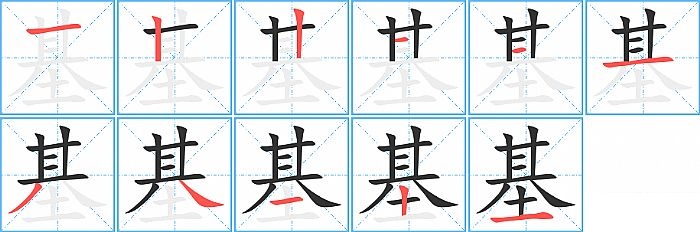 基是上下结构,基的部首是“土”,部外笔画8画,总笔画11画,基的笔画顺序是“横、竖、竖、横、横、横、撇、捺、横、竖、横”。