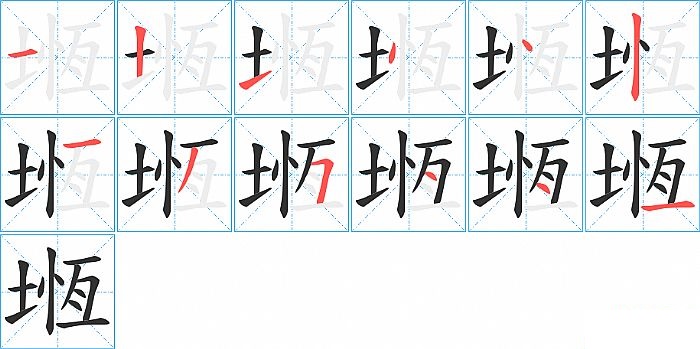 堩是左右结构,堩的部首是“土”,部外笔画9画,总笔画12画,堩的笔画顺序是“横、竖、提、点、点、竖、横、竖、横折、横、横、横”。看看“堩”字什么意思 >>
