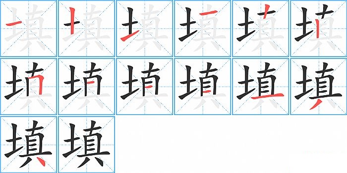 填是左右结构,填的部首是“土”,部外笔画10画,总笔画13画,填的笔画顺序是“横、竖、提、横、竖、竖、横折、横、横、横、横、撇、点”。看看“填”字什么意思 >>