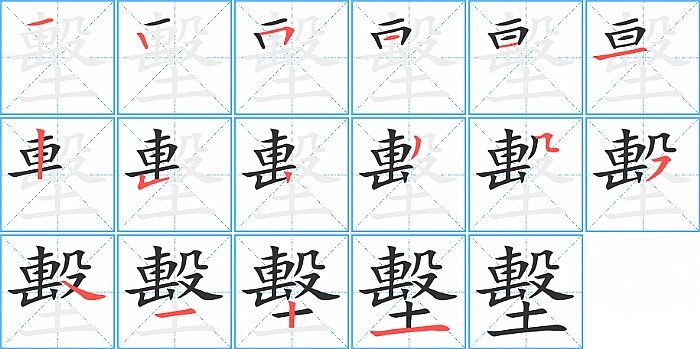 墼是上下结构,墼的部首是“土”,部外笔画13画,总笔画16画,墼的笔画顺序是“横、竖、横折、横、横、横、竖、竖折/竖弯、竖、撇、横折折/横折弯、横撇/横钩、捺、横、竖、横”。看看“墼”字什么意思 >>