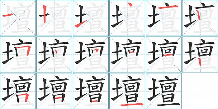壇是左右结构,壇的部首是“土”,部外笔画13画,总笔画16画,壇的笔画顺序是“横、竖、提、点、横、竖、横折、竖、横折、横、横、竖、横折、横、横、横”。看看“壇”字什么意思 >>