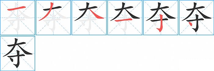 夺是上下结构,夺的部首是“大”,部外笔画3画,总笔画6画,夺的笔画顺序是“横、撇、捺、横、竖钩、点”。