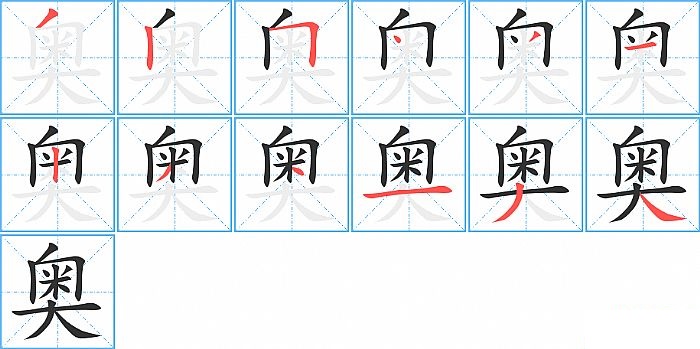 奥是上下结构,奥的部首是“大”,部外笔画9画,总笔画12画,奥的笔画顺序是“撇、竖、横折、点、撇、横、竖、撇、点、横、撇、捺”。看看“奥”字什么意思 >>