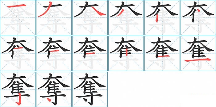 奪是上下结构,奪的部首是“大”,部外笔画11画,总笔画14画,奪的笔画顺序是“横、撇、捺、撇、竖、点、横、横、横、竖、横、横、竖钩、点”。看看“奪”字什么意思 >>