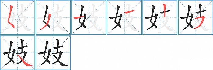 《妓》字的笔顺分步演示图(一笔一画写汉字)
