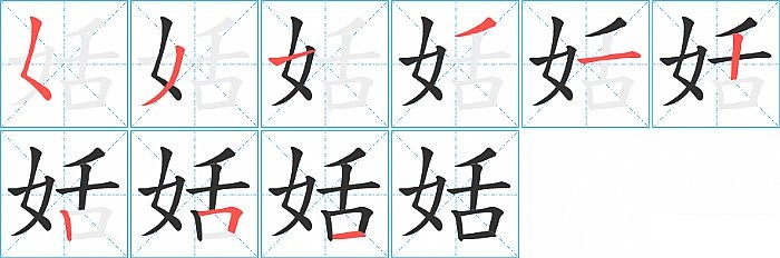 姡是左右结构,姡的部首是“女”,部外笔画6画,总笔画9画,姡的笔画顺序是“撇点、撇、横、撇、横、竖、竖、横折、横”。