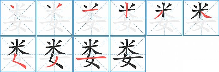 娄是上下结构,娄的部首是“女”,部外笔画6画,总笔画9画,娄的笔画顺序是“点、撇、横、竖、撇、捺、撇点、撇、横”。