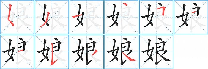 娘是左右结构,娘的部首是“女”,部外笔画7画,总笔画10画,娘的笔画顺序是“撇点、撇、横、点、横折、横、横、竖提、撇、捺”。看看“娘”字什么意思 >>