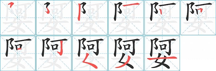 娿是上下结构,娿的部首是“女”,部外笔画7画,总笔画10画,娿的笔画顺序是“横折折折钩/横撇弯钩、竖、横、竖、横折、横、竖钩、撇点、撇、横”。看看“娿”字什么意思 >>