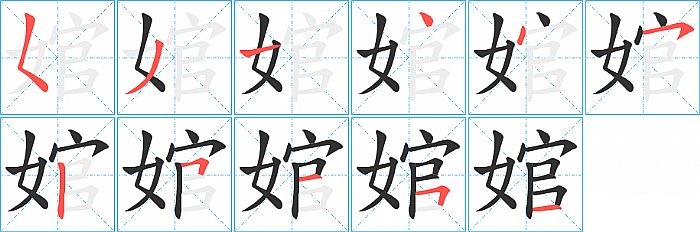 婠是左右结构,婠的部首是“女”,部外笔画8画,总笔画11画,婠的笔画顺序是“撇点、撇、横、点、点、横撇/横钩、竖、横折、横、横折、横”。看看“婠”字什么意思 >>