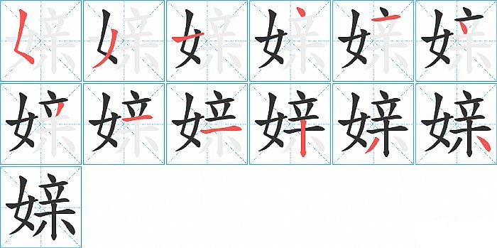 媇是左右结构,媇的部首是“女”,部外笔画9画,总笔画12画,媇的笔画顺序是“撇点、撇、横、点、横、点、撇、横、横、竖钩、撇、点”。看看“媇”字什么意思 >>