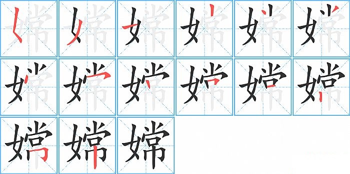 嫦是左右结构,嫦的部首是“女”,部外笔画11画,总笔画14画,嫦的笔画顺序是“撇点、撇、横、竖、点、撇、点、横撇/横钩、竖、横折、横、竖、横折钩、竖”。看看“嫦”字什么意思 >>