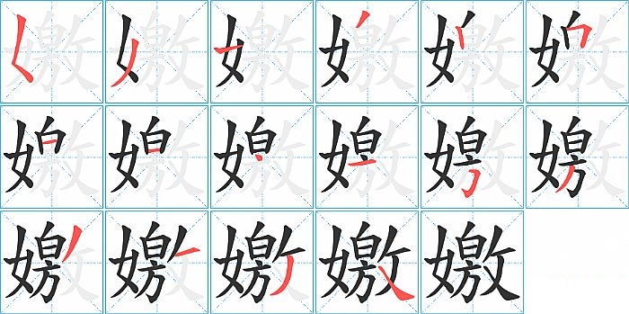 嬓是左右结构,嬓的部首是“女”,部外笔画13画,总笔画16画,嬓的笔画顺序是“撇点、撇、横、撇、竖、横折、横、横、点、横、横折钩、撇、撇、横、撇、捺”。看看“嬓”字什么意思 >>