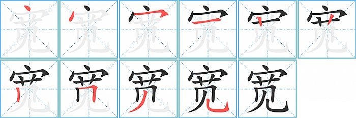 宽是上下结构,宽的部首是“宀”,部外笔画7画,总笔画10画,宽的笔画顺序是“点、点、横撇/横钩、横、竖、竖、竖、横折、撇、竖弯钩”。看看“宽”字什么意思 >>