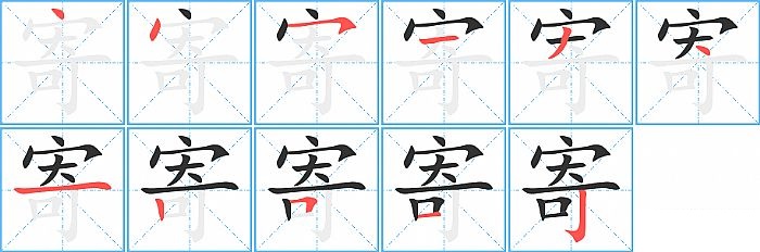 寄是上下结构,寄的部首是“宀”,部外笔画8画,总笔画11画,寄的笔画顺序是“点、点、横撇/横钩、横、撇、点、横、竖、横折、横、竖钩”。看看“寄”字什么意思 >>