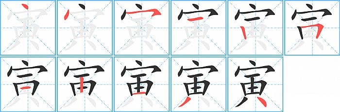 寅是上下结构,寅的部首是“宀”,部外笔画8画,总笔画11画,寅的笔画顺序是“点、点、横撇/横钩、横、竖、横折、横、竖、横、撇、点”。看看“寅”字什么意思 >>