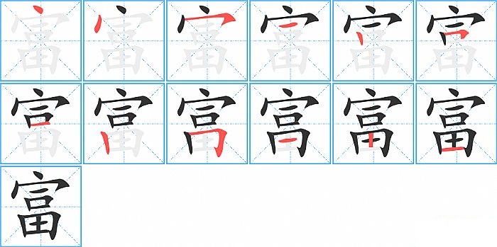 富是上下结构,富的部首是“宀”,部外笔画9画,总笔画12画,富的笔画顺序是“点、点、横撇/横钩、横、竖、横折、横、竖、横折、横、竖、横”。看看“富”字什么意思 >>