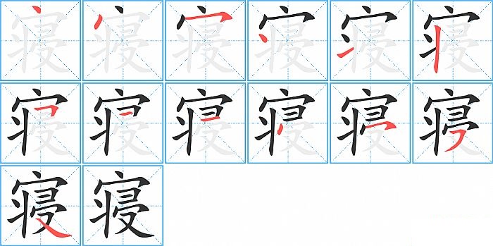 寝是上下结构,寝的部首是“宀”,部外笔画10画,总笔画13画,寝的笔画顺序是“点、点、横撇/横钩、点、提、竖、横折、横、横、点、横撇/横钩、横撇/横钩、捺”。看看“寝”字什么意思 >>