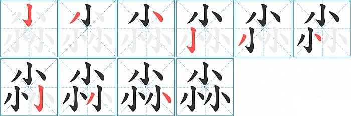 尛是品字结构,尛的部首是“小”,部外笔画6画,总笔画9画,尛的笔画顺序是“竖、撇、点、竖钩、撇、点、竖钩、撇、点”。