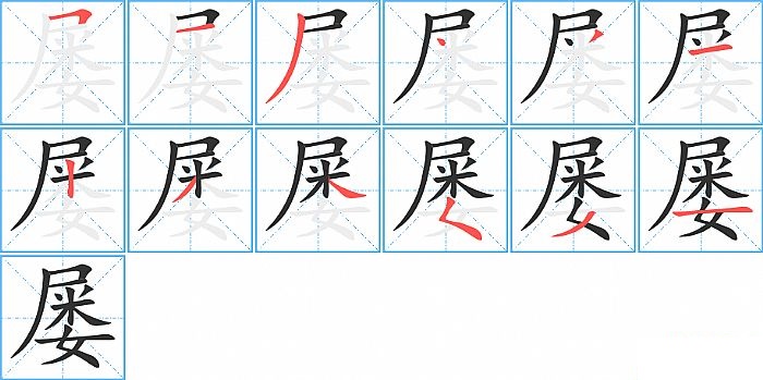 屡是半包围结构,屡的部首是“尸”,部外笔画9画,总笔画12画,屡的笔画顺序是“横折、横、撇、点、撇、横、竖、撇、捺、撇点、撇、横”。看看“屡”字什么意思 >>