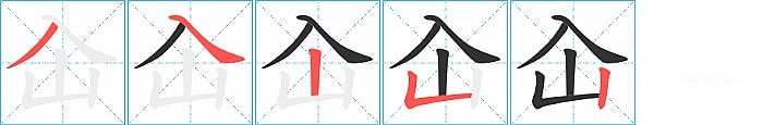 屳是上下结构,屳的部首是“山”,部外笔画2画,总笔画5画,屳的笔画顺序是“撇、捺、竖、竖折/竖弯、竖”。