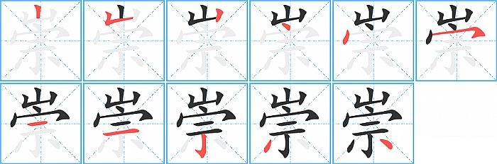 崇是上下结构,崇的部首是“山”,部外笔画8画,总笔画11画,崇的笔画顺序是“竖、竖折/竖弯、竖、点、点、横撇/横钩、横、横、竖钩、撇、点”。看看“崇”字什么意思 >>