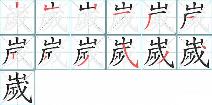 嵗是上下结构,嵗的部首是“山”,部外笔画9画,总笔画12画,嵗的笔画顺序是“竖、竖折/竖弯、竖、横、撇、横、竖、撇、撇、斜钩、撇、点”。看看“嵗”字什么意思 >>